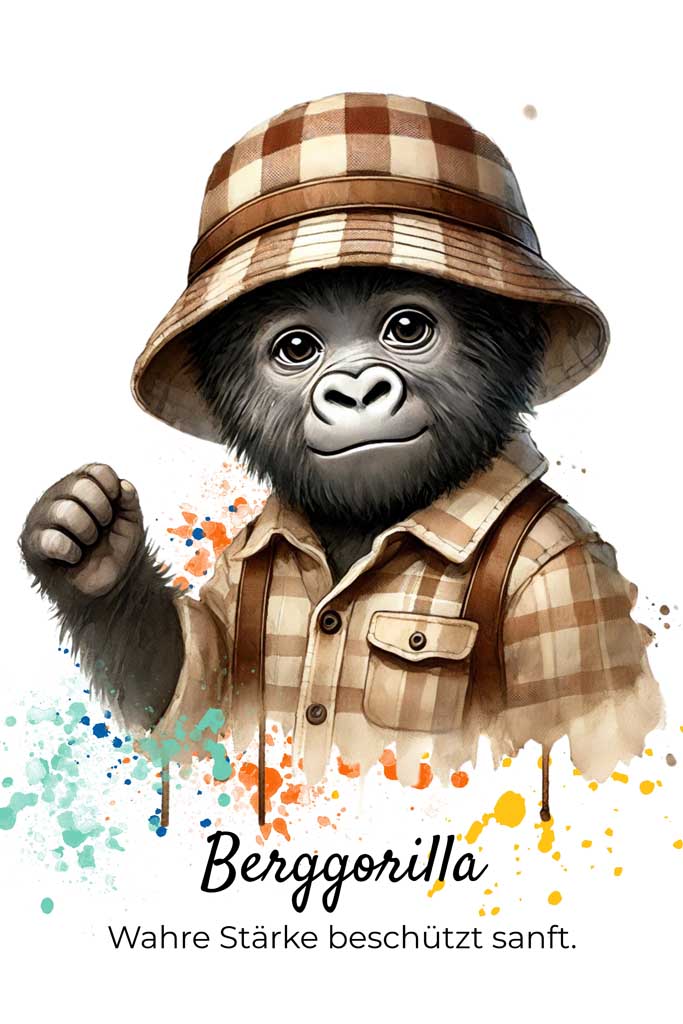 Für mich war der Berggorilla schon immer ein Symbol für stille Kraft und tiefe Verbundenheit. Mit diesem Bild möchte ich zeigen, dass Stärke nicht laut sein muss – sondern liebevoll, behutsam und echt. Ein Bild für alle kleinen und großen Herzen, die sich von echtem Mut berühren lassen wollen.