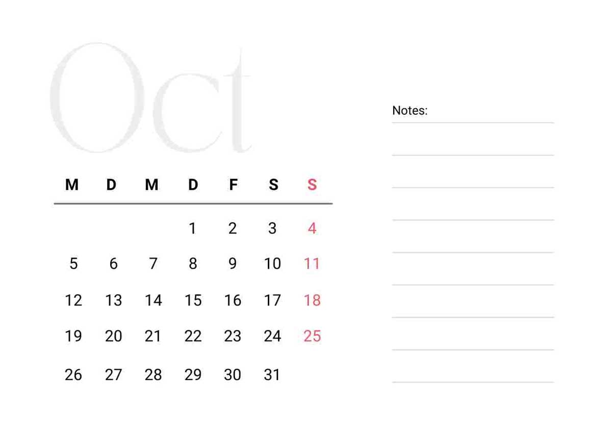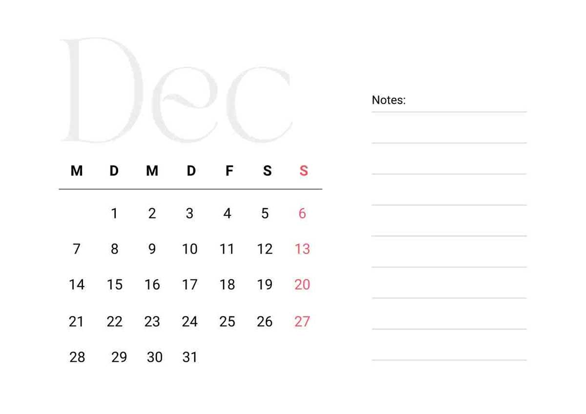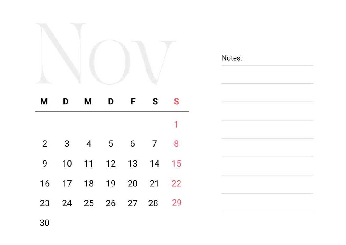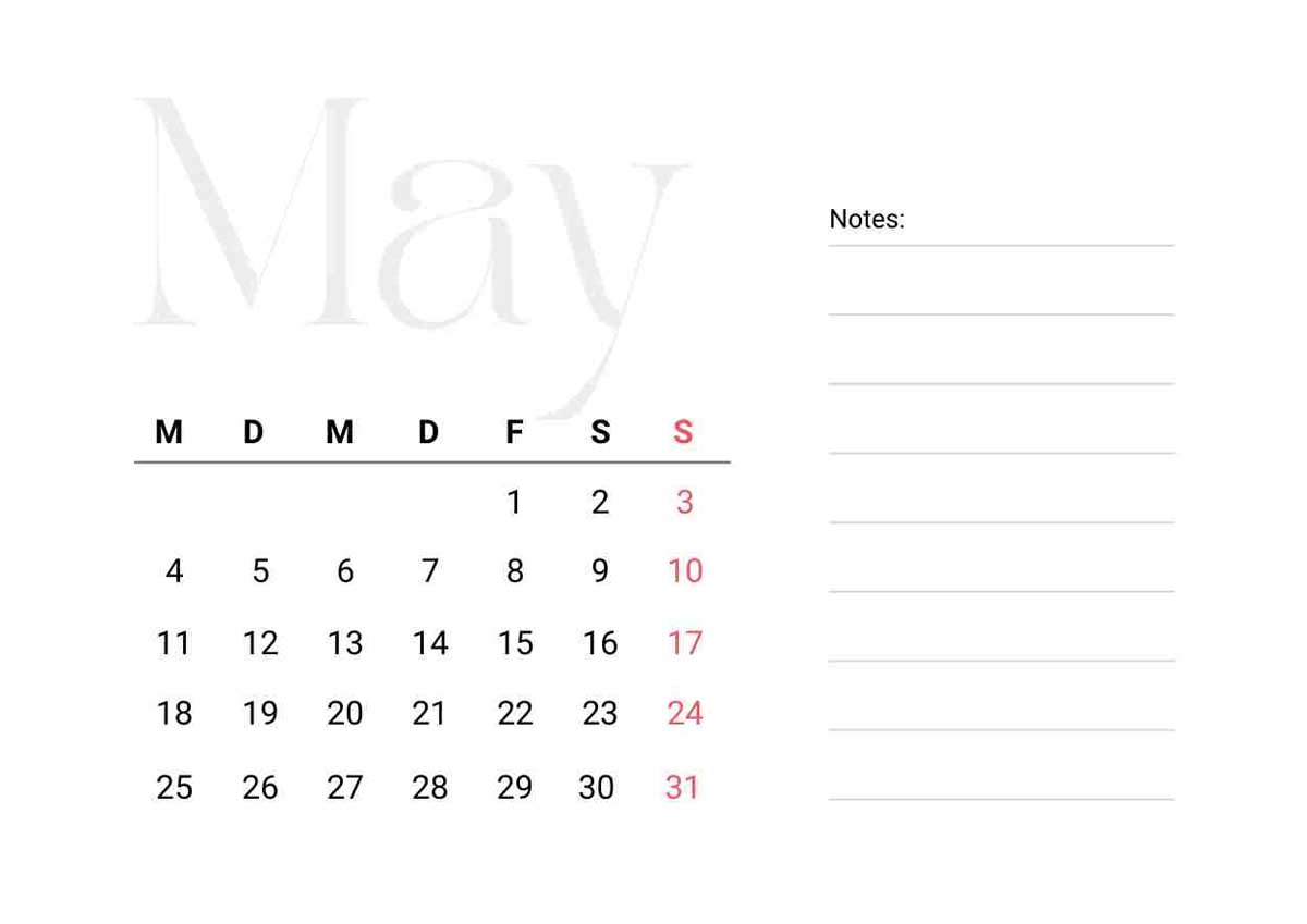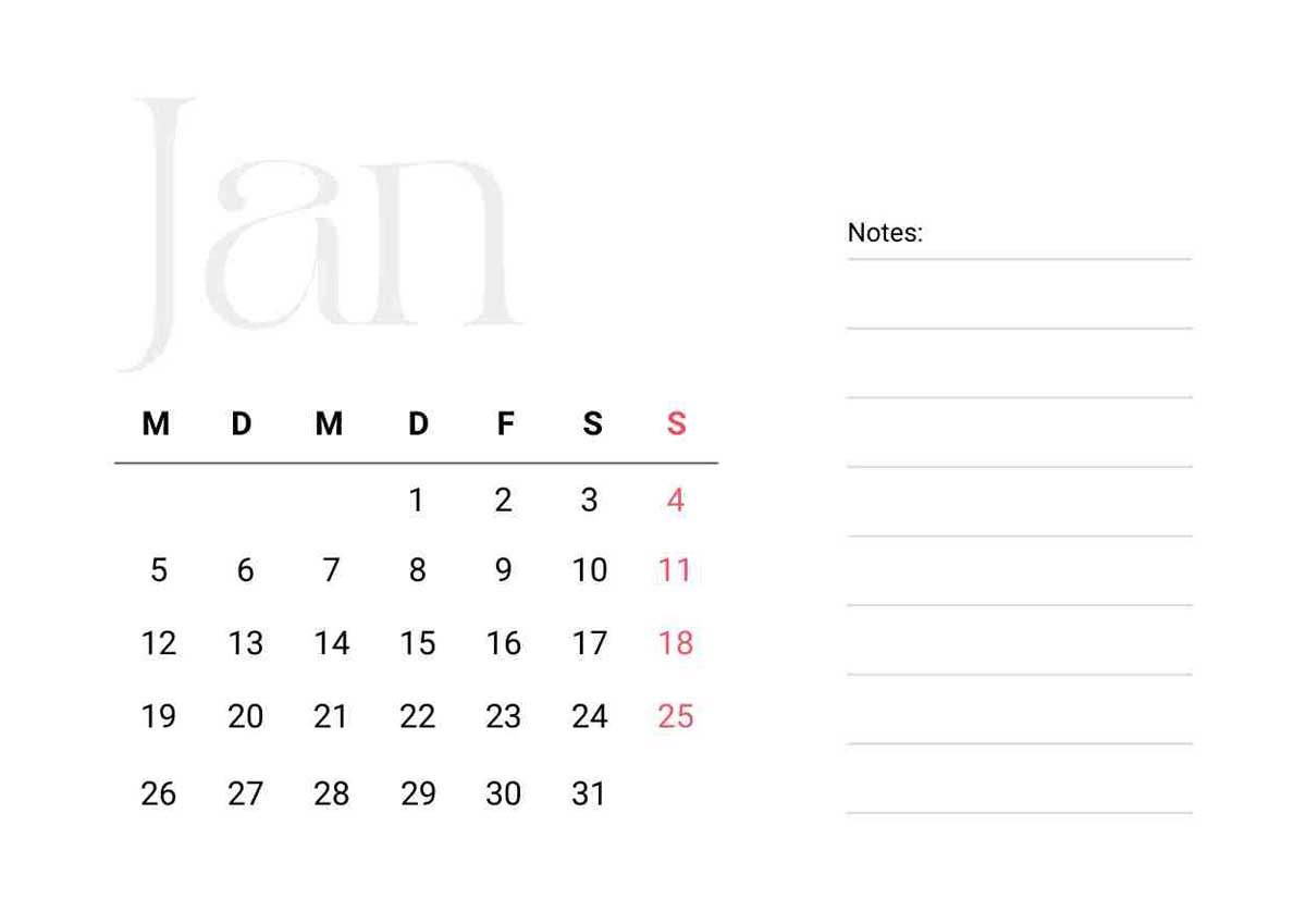 Das Design ist im Querformat angelegt, 27,9 × 21 cm, ideal zum Ausdrucken als Wandkalender.