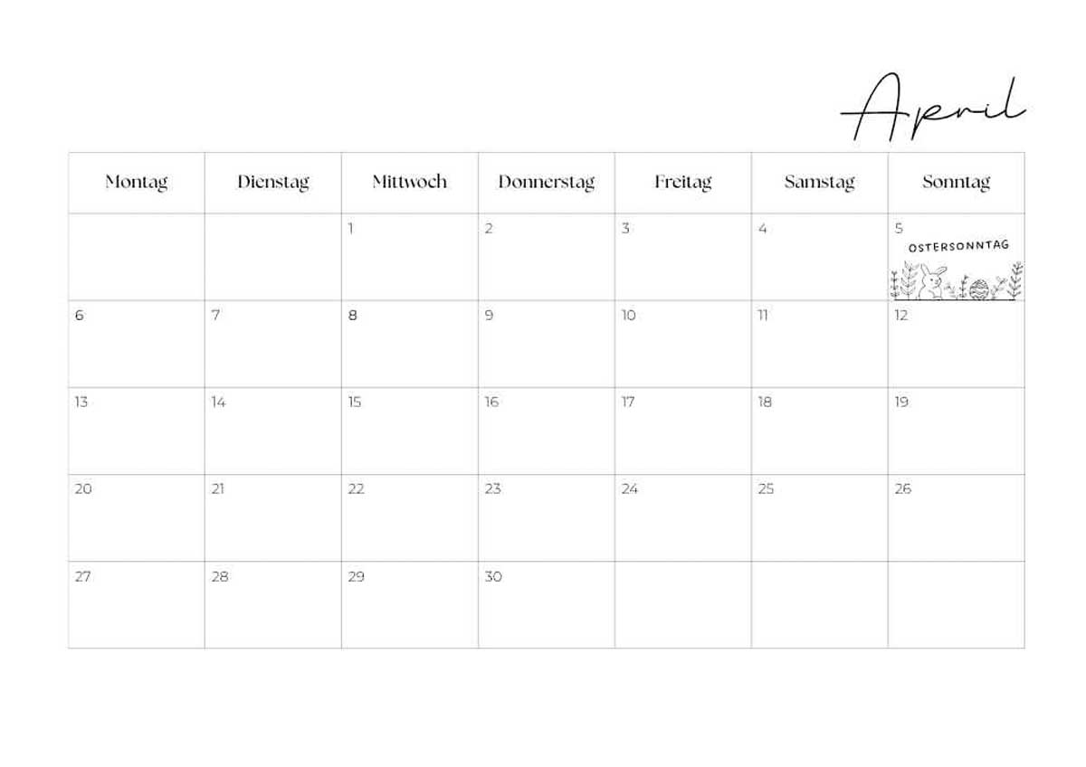 Das Design ist im Querformat angelegt, 27,9 × 21 cm, ideal zum Ausdrucken als Wandkalender.